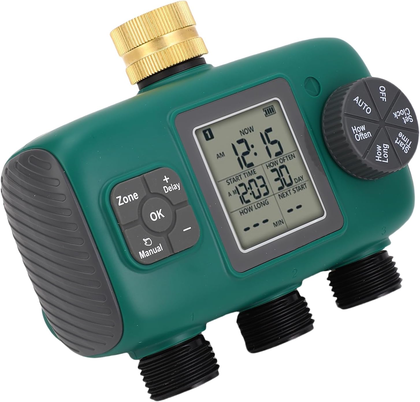 Item Type: 3 Outlet Sprinkler TimerMaterial: Brass, PCMinimum Maximum Working Pressure: 0.05-0.8Mpa / 7.25-116psiWorking Temperature: 4.5℃-45℃ / 40.1℉-113℉Power Source: 2 x AA Batteries (batteries not included)Water Proof Level: IPX5Rain Delay: 1 day, up to 15 daysHose Connector: NH4/3in male thread Package List:1 x 3 Port Irrigation Water Valve5 x Accessories1 x User Manual