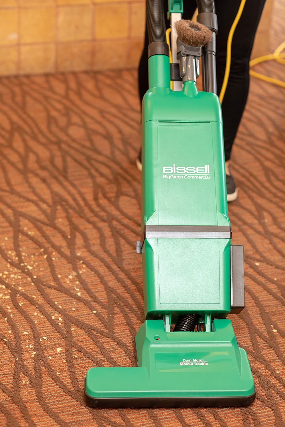 Bissell BigGreen Commercial dual motors upright vacuum has commercial heavy duty high efficiency suction motor with powerful brushroll motor. Hi-tech fire retardant sound deadening gel for quiet use during daytime or night time cleaning. It has 15-inches cleaning path, long lasting geared drive belt and self-adjusting head. It's 3-way switch turns on both motors or suction motor only. Patent pending perfect lock stretchable attachment hose, that is dependable screw-in fit so hose locks in without fail, hose stretches from 3-feet to 6-feet. built-in circuit breaker automatically shuts off of brushroll motor so you cannot damage motor. Superior cleaning with L-shaped base for those hard-to-reach places. Perfect quick change cord system includes pigtail cord plugs into 50-feet heavy duty extension cord that requires no more down time or costly repairs. Large cord wraps so 50-feet cord fits easily on machine. It features an comfort-clean handle grip. Attachments includes crevice tool, plastic wand, combo dust brush/ upholstery tool. High Filtration cartridge filter snaps on and off for easy use/easy replacement.